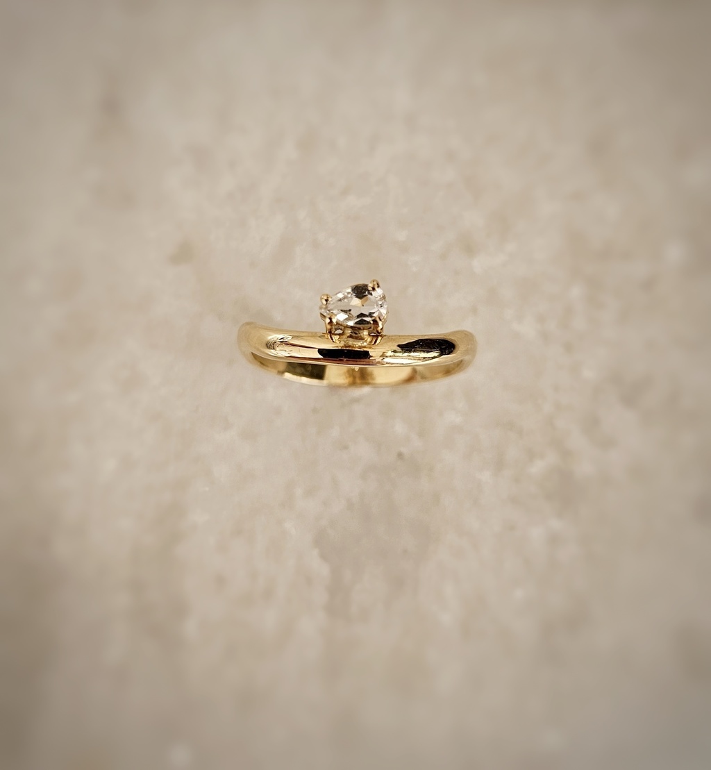 Anel em ouro amarelo 18k com aro ondulado e gota de topázio incolor.